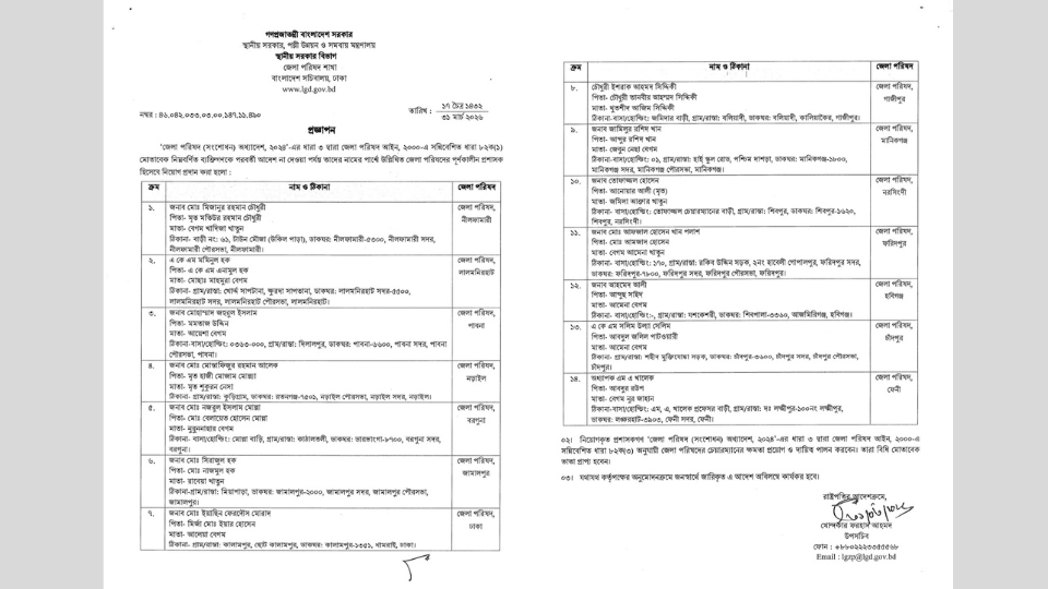 ফরিদপুর সহ আরো ১৪ জেলার জেলা পরিষদের প্রশাসক নিয়োগ