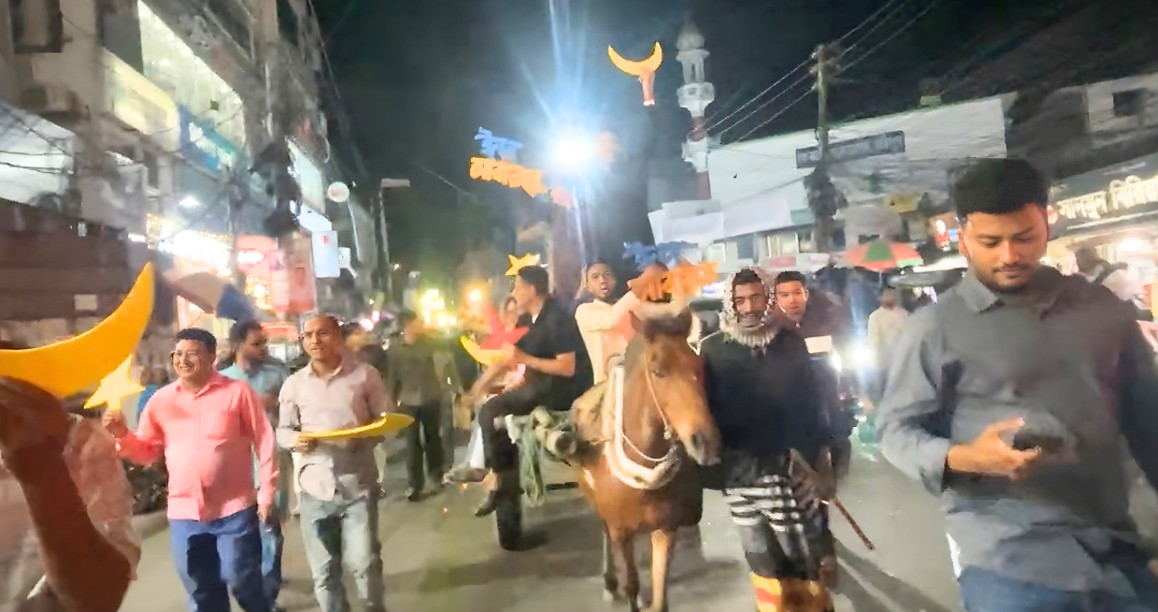 তারাবজি জ্বালিয়ে, ঘোড়ার গাড়িতে চড়ে এক আনন্দঘণ শোভাযাত্রা বের করা হয় ফরিদপুরে। ফরিদপুরের তরুণদের উদ্যোগে শুক্রবার সন্ধায় শহরের জনতা ব্যাংকের